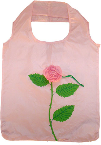 We are proud to introduce our florist collection. This reusable tote bag folds up into a pouch shaped like a rose flower. The bag is made of polyester, a durable and washable fabric. The rose tote has an elastic drawstring attached for easy closure.