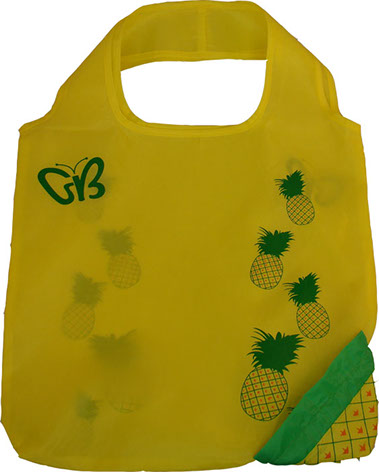 We are proud to introduce our fruits & vegetable collection. This reusable tote bag folds up into a pouch shaped like a pineapple. The bag is made of polyester, a durable and washable fabric. The tote has an elastic drawstring attached for easy closure.