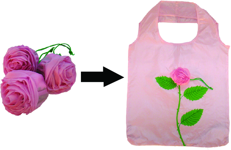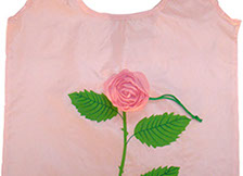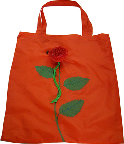 We are proud to introduce our florist collection. This reusable tote bag folds up into a pouch shaped like a rose flower. The bag is made of polyester, a durable and washable fabric. The rose tote has an elastic drawstring attached for easy closure.