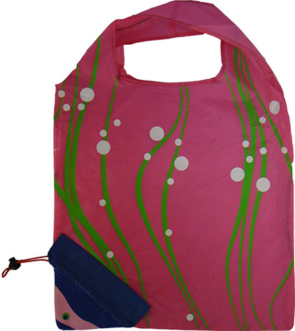 We are proud to introduce our animal collection. This reusable tote bag folds up into a pouch shaped like a fish. The bag is made of polyester, a durable and washable fabric. The fish tote has an elastic drawstring attached for easy closure. This tote has a spacious main compartment for all of your shopping needs.